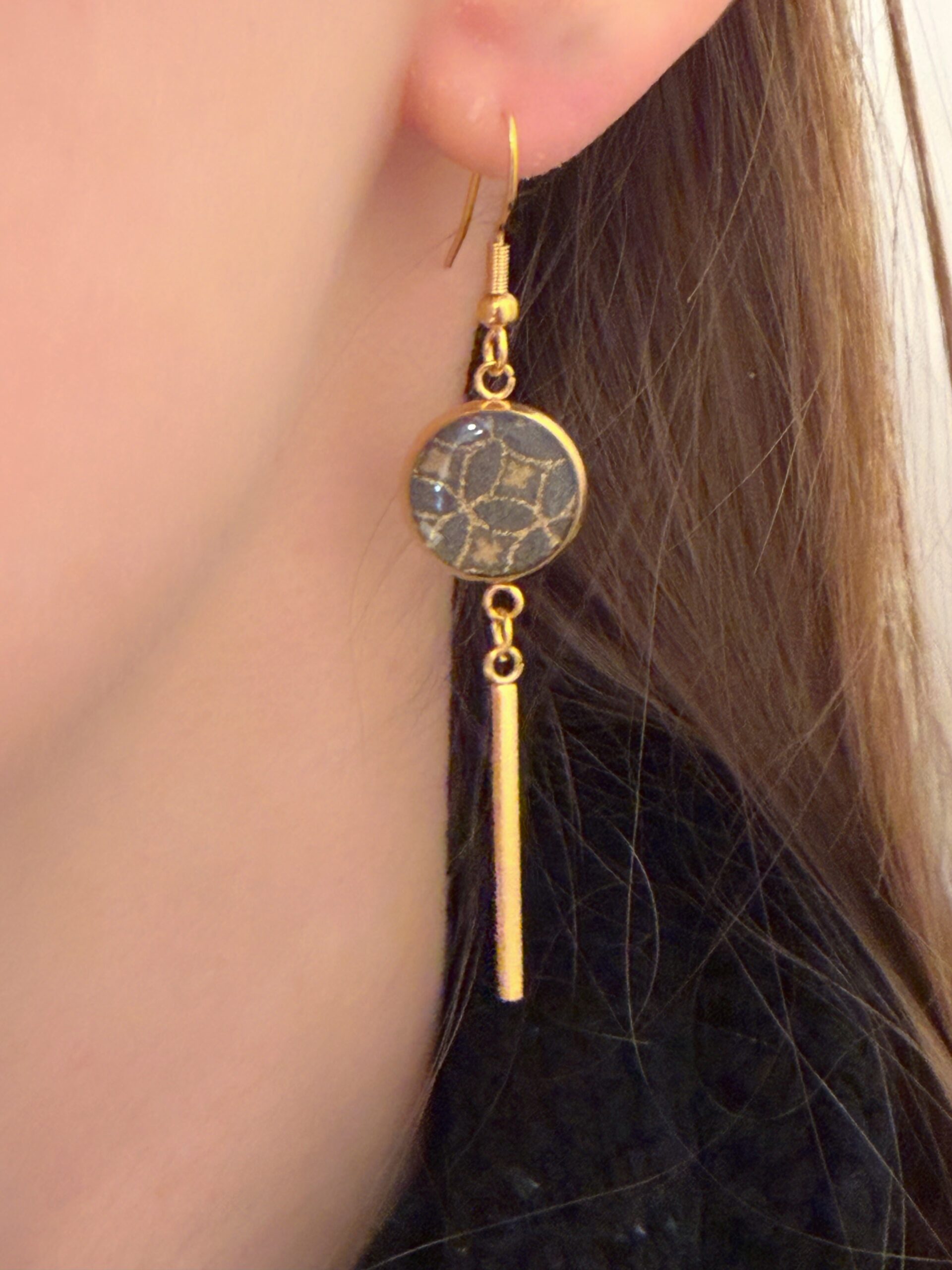 Handgemaakte oorbellen met staafje goud. Kleur: denimblauw/goud. Roestvrij staal. Lengte: 5,5 cm Elk stuk is uniek en kan daarmee licht afwijken van de afbeelding.