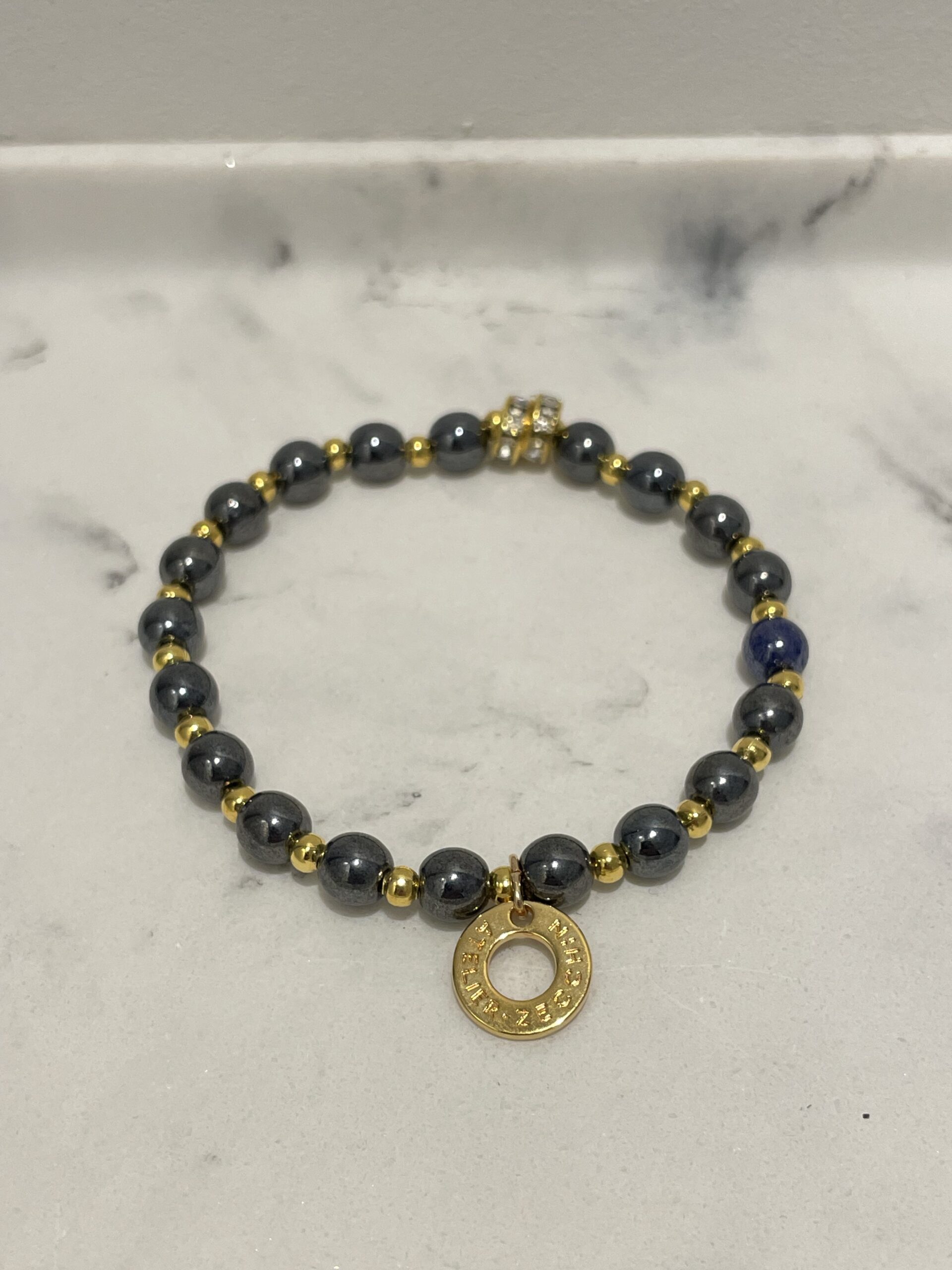 Armband op elastiek met Murano spiegelreflex kralen (ca. 6 mm) en kleine vergulde tussenstukjes. Nikkelvrij. Voor polsomtrek tot ca. 19cm